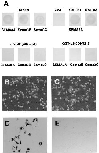 Figure 8. Binding of semaphorins, VEGF, and plexins to the recombinant neuropilin-1 proteins. (A) Bindings of SEMA3A-AP, Sema3B-AP and Sema3C-AP to the immobilized NP-Fc, GST, GST-b1, GST-b2, GST-b1(347–364), and GST-b2(504–521) were visualized with NBT/BCIP. (B and C) Adhesion of L cells to the immobilized NP-Fc in the presence of SEMA3A (C) and VEGF165 (D). SEMA3A and VEGF165 do not interfere with the binding of L cells to NP-Fc. (D and E) Binding of GST-tagged recombinant proteins for the cell adhesion sites of neuropilin-1 to myc-tagged plexinA3 expressed in COS-7 cells. The plexinA3 was visualized by immunohistochemistry with anti-myc antibody (D). GST-b1(347–364) and GST-b2(504–521) bound to the cells were detected by immunohistochemistry with anti-GST antibody. Bars, 100 μm.