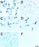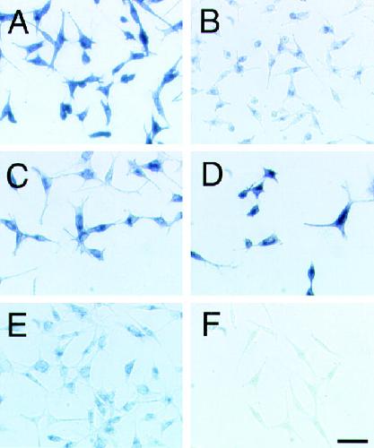 Figure 7. Binding of AP-tagged semaphorin 3A (SEMA3A-AP) to mutant neuropilin-1 proteins. Binding of SEMA3A-AP to the transfectants expressing NP-full 86 (A; see Fig. 1 B), NP-bc 30 (B; see Fig. 1 B), NP-ac 24 (C; see Fig. 2 B), NP-abm 716 (D; see Fig. 2 C), NP-am 38 (E; see Fig. 2 C), and NP-c 68 (F; see Fig. 1 B). SEMA3A-AP bound to cell surface was visualized with NBT/BCIP. Bar, 100 μm.