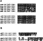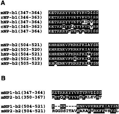 Figure 9. Comparison of amino acid sequences in cell adhesion sites among vertebrate neuropilin-1s (A) or the mouse neuropilin family (B). The amino acid sequences in the cell adhesion sites are highly conserved among the mouse (mNP), rat (rNP), human (hNP), chicken (cNP), and Xenopus (xNP) neuropilin-1s. On the other hand, only about half of the amino acid residues of the cell adhesion site of mouse neuropilin-1 and of mouse neuropilin-2 are identical.