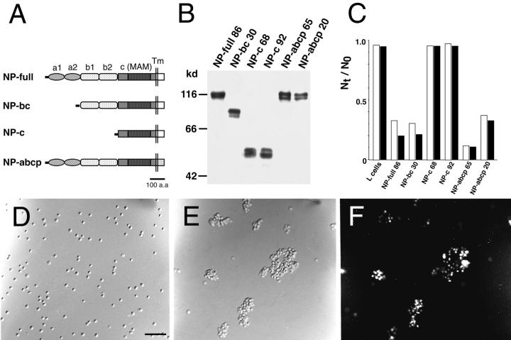Figure 1. Cell adhesion activity of transfectants which express mutant neuropilin-1 proteins (Part 1). (A) A schematic representation of mutant neuropilin-1s. NP-full, intact neuropilin-1; NP-bc, neuropilin-1 lacking the a1 and a2 domains; NP-c, neuropilin-1 protein lacking the a1, a2, b1, and b2 domains; NP-abcp, neuropilin-1 whose transmembrane and cytoplasmic regions are replaced by that of the Xenopus plexin. (B) Immunoblot of transfectants expressing intact and mutant neuropilin-1 proteins, by using an antibody raised against the b1-c domains. The number followed by the name of the construct represents the clone number. (C) Quantification of cell aggregation activity of the mutant neuropilin-1s. The degree of aggregation of transfectants is expressed by the index Nt/N0, where Nt and N0 are the total particle number at incubation times t and 0, respectively. White and black bars represent N30/N0 and N60/N0, respectively. (D–F) Cell aggregation at 60 min in gyration, detected by phase contrast (D and E) or fluorescence microscope (F). Parental L cells do not show cell aggregability (D). In contrast, fluorescein-labeled parental L cells and transfectants expressing NP-full 86 form mixed cell aggregates (E and F). E and F show the same field. Bar, 100 μm.
