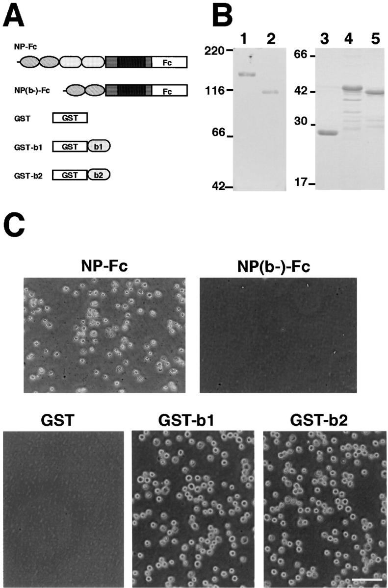 Figure 3. Cell adhesion activity of the recombinant neuropilin-1 proteins. (A) A schematic representation of the Fc-tagged full-length neuropilin-1 extracellular segment (NP-Fc) and the b1-b2 domains–deleted one [NP(b-)-Fc], and GST-tagged recombinant b1 (GST-b1) and b2 (GST-b2) domains. (B) SDS-PAGE of the recombinant proteins stained with Coomassie brilliant blue G-250. Lanes 1–5 correspond to NP-Fc, NP(b-)-Fc, GST, GST-b1, and GST-b2 recombinant proteins, respectively. (C) Cell adhesion to the recombinant proteins immobilized on nitrocellulose-coated culture dishes. L cells adhere to Fc-NP, GST-b1, and GST-b2 but not NP(b-)-Fc and GST. Bar, 100 μm.