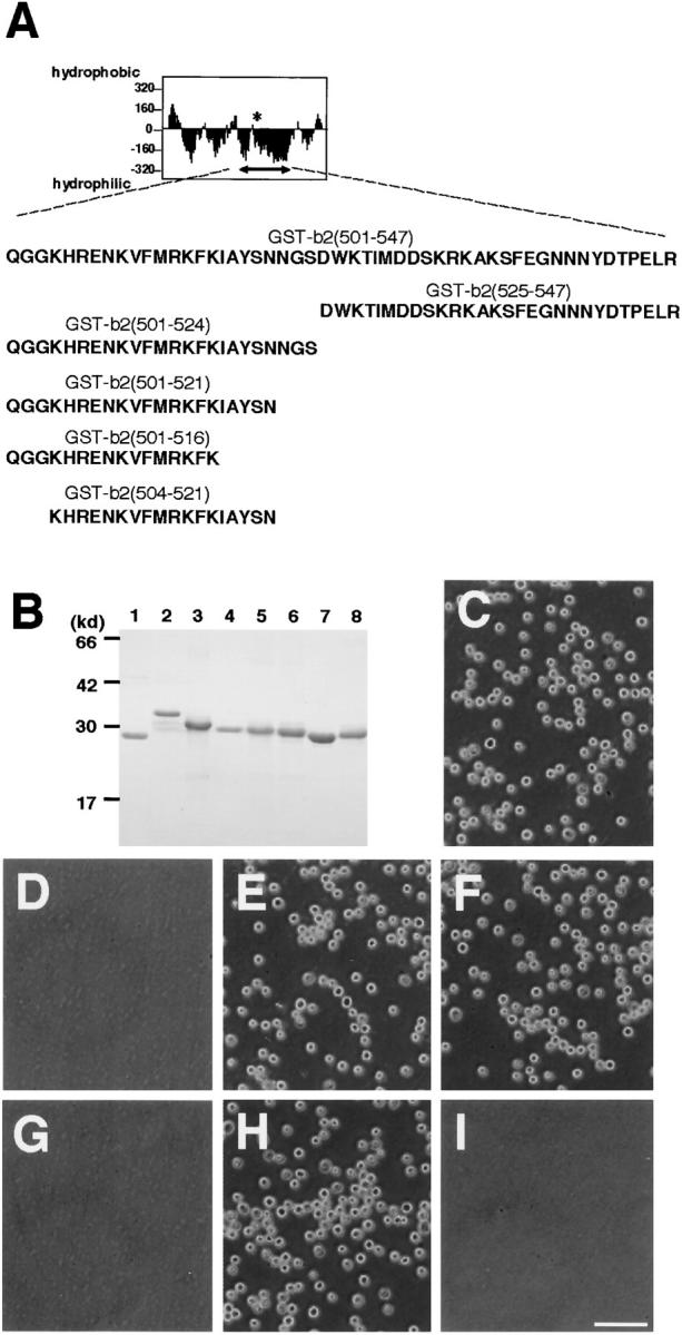 Figure 4. Determination of cell adhesion sites in the b2 domain. (A) A list of synthesized peptides in the b2 domain. The upper figure represents the Kyte-Doolittle hydoropathy plot of the b2 domain. An asterisk indicates a putative glycosylation site. An arrow indicates the region to which a series of GST-tagged recombinant proteins are synthesized. The number in the name of each recombinant protein indicates the position of the amino acid residues. (B) SDS-PAGE of the affinity-purified recombinant proteins. Lane 1, GST; lane 2, GST-b2(501–547); lane 3, GST-b2(525–547); lane 4, GST-b2(501–524); lane 5, GST-b2(501–521); lane 6, GST-b2(501–516); lane 7, GST-b2(504–521); and lane 8, GST-b1(347–364; see the legend for Fig. 5). The gel was stained with Coomassie brilliant blue G-250. (C–I) Adhesion of L cells to the immobilized recombinant proteins at 30 min. C, GST-b2(501–547); D, GST-b2(525–547); E, GST-b2(501–524); F, GST-b2(501–521); G, GST-b2(501–516); H, GST-b2(504–521). Trypsin-treated L cells did not adhere to GST-b2(504–521) (I). Bar, 100 μm.
