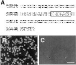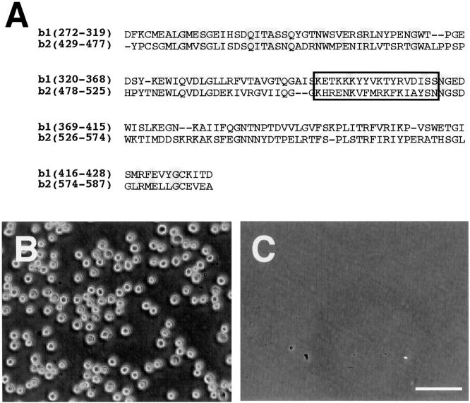 Figure 5. Determination of cell adhesion sites in the b1 domain. (A) Amino acid alignment of the b1 and b2 domains. Shaded boxes indicate consensus sequences. An open box indicates the cell adhesion sites in the b2 domain and its homologous region (347–364 aa) in the b1 domain. (B and C) Cell adhesion activity of the GST-tagged b1(347–364) recombinant protein [GST-b1(347–364)]. L cells (B) but not trypsin-treated L cells (C) adhere to the immobilized GST-b1(347–364). Bar, 100 μm.