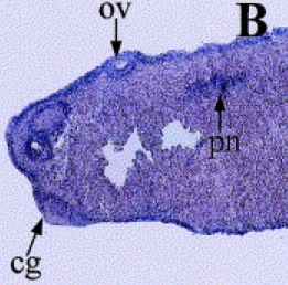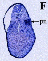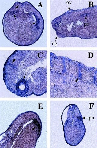 Fig. 4. Localized expression pattern of Xpar-6 from the mid-neurula to the tadpole stage by in situ hybridization on tissue sections. (A) A transverse section of a mid-neurula stage embryo. Xpar-6 transcripts are localized to the epidermal ectoderm, neural plate (arrowhead) and intermediate mesodermal region which will form the pronephros (arrows). (B) At the late tailbud stage, Xpar-6 transcripts mark the eye, otic vesicle (ov), pronephros (pn) and brain, but are excluded from the cement gland (cg). (C) A sagittal section of head region at the late tailbud stage. Xpar-6 is visible as a stripe (arrowhead) in the brain region. An arrow indicates eye. (D) A sagittal section of a tadpole stage embryo shows Xpar-6 expression outlining the somite borders (arrowhead). (E) Xpar-6 transcripts can be seen in the proctodeum (arrowhead). (F) A cross section of a late tailbud stage embryo representing Xpar-6 transcripts localized to the pronephros (pn). Magnification: B,E, Ã50; A,C,F, Ã100; D, Ã200.