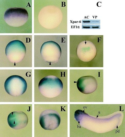 Fig. 3. Spatiotemporal expression pattern of Xpar-6 assayed by whole-mount in situ hybridization. (A) Lateral view of an egg showing enhanced signal in the animal region, with animal pole at top. (B) Sense probe control â egg. (C) The pattern in A was confirmed by RTâPCR analysis of Xpar-6 in animal cap (AC) and vegetal pole (VP) explants from fertilized eggs. EF-1a was used as a loading control. (D,E) A stage 11 embryo viewed, ventrally and dorsally, respectively, with anterior at top. Arrowheads indicate yolk plug. (F) Vegetal view of a stage 11 embryo shows moderate staining of Xpar-6 in a yolk plug, with dorsal side at top. An arrow indicates dorsal lip of blastopore. (G) Dorsal and (H) anteroventral views, with anterior at top, of an early neurula showing Xpar-6 transcripts localized to the dorsolateral region and anterior end of the presumptive neural area. (I) Anterolateral and (J) anterodorsal views, with anterior to the left, of mid-neurula stage embryos. Xpar-6 is expressed in the lateral region along the ridges of neural fold and extreme anterior region surrounding the anterior edge of the neural plate. Bilaterally symmetric pattern of Xpar-6 expression is also observed in patches (arrowheads) in the anterior region of the neural plate. (K) Side view, with anterior to the left, of a late neurula stage embryo. (L) A late tailbudembryo viewed laterally. Xpar-6 expression is intense in the head, labeling the eyes, branchial arches, otic vesicles and brain. Posterior to the head, Xpar-6 is expressed in the somites, pronephros, tail tip and proctodeum. ov, otic vesicle; s, somite; ba, branchial arches; pd, proctodeum.