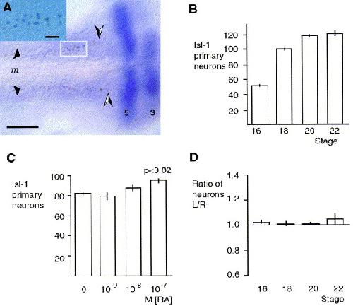 A quantitative analysis of Isl1+ primary sensory neurons in the Xenopus embryo. In all figures, embryos are shown with anterior to the right. (A). The Xenopus embryo expresses Isl1 in columns either side of the midline (m) predominantly in primary sensory neurons (black arrowheads). The Isl1+ primary sensory neurons (enlarged in insert) are found at equal density along the length of the posteriorneurectoderm. The anterior border for Isl1+ primary sensory neurons (black and white arrowheads) is a short distance caudal to rhombomere 5 shown by double labelling with the rhombomere marker krox-20 which identifies rhombomeres 3 and 5 (marked on the figure). Scale bars: main image 120 μm, inset 20 μm. (B). Time course of formation of Isl1+ primary sensory neurons. The mean number of Isl1+ primary sensory neurons per side of an embryo was determined for more than 10 embryos at each developmental stage. The bars represent the standard error of this calculation. At stage 22 there was a mean of 120 Isl1+ primary sensory neurons on each side of the embryo. (C). The effect of applied RA on the numbers of Isl1+ primary sensory neurons. The mean number of Isl1+ primary sensory neurons for one side of an embryo was calculated for at least ten embryos at stage 17 over a range of applied RA concentrations, bars represent the standard error of the calculation. In untreated embryos there was a mean of 82 (SE 3.5) and in embryos grown from the late blastula stage in 10â7 M RA there was a mean of 95 (SE 3.0) Isl1+ primary sensory neurons. (D). There is no asymmetry in the formation of Isl1+ primary sensory neurons. The ratio of the number of Isl1+ primary sensory neurons on the left compared to the right side of the embryo was determined from mid to late neurula stages for more than 8 embryos at each stage. There was no significant difference in the number of neurons on one side compared to the other.