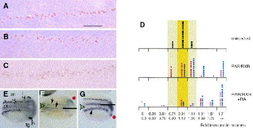 Fig. 2. Elevated retinoid signalling increases the number of primary sensory neurons. (AâC). Isl1+ primary sensory neurons at stage 20 in (A) control, (B) RAR/RXR mRNA injected and (C) RAR/RXR mRNA injected + RA treated embryos. The number of neurons increases in embryos subjected to elevated retinoid signalling though the neurons are still found in restricted, if widened, domains and are not dispersed throughout the neurectoderm. Scale bar applies to each panel AâC and represents 60 μm. (D). The ratio of Isl1+ primary sensory neurons on the left compared to the right side of the embryo was calculated for uninjected controls (top panel). Each dot represents an individual embryo. The peak (dark yellow) and distribution ranges (light yellow) of the ratio of Isl1+ primary sensory neurons are indicated. Isl1+ primary sensory neurons were then counted in embryos unilaterally injected with RAR/RXR (middle panel) and RAR/RXR with 10â7 M RA (lower panel). The blue dots represent individual embryos injected with 250â500 pg and red dots individuals with 62-125pg of RNA. Following injection of 250â500 pg of RAR/RXR mRNA most individuals have increased numbers of Isl1+ primary sensory neurons on the injected side. Following RA treatment a larger proportion of embryos have increased numbers of Isl1+ primary sensory neurons on the injected side. In a small number of cases (marked with a â symbol) there is a significant decrease in the number of Isl1+ primary sensory neurons on the injected side of embryos receiving 250â500 pg of RNA. In these cases it appeared as if gastrulation was compromized on the injected side of the embryo. (EâG) Neural specific tubulin expression assayed by wholemount in situ hybridization in (E), control, (F), RAR/RXR mRNA injected and (G), RAR/RXR mRNA injected + RA treated embryos. The three domains of primary neurons either side of the midline are marked in (E), s, sensory, i, inter and m, motor neurons. The expression of NST in the trigeminal ganglion is also marked (tg). (F) the injected side is marked with a red dot and the horizontal bar marks the midline. There is increased NST expression in the sensory neuron and motor neuron domains (black arrows) compared to the uninjected side. However, these domains remain separated by a region of neurectderm that does not express NST (open arrow). (G). Increased NST expression is seen on the injected side of the embryo grown in 10â7 M RA but still does not extend significantly into the non-neural ectoderm or into the region of the neurectoderm between sensory and motor neuron domains (open arrow).