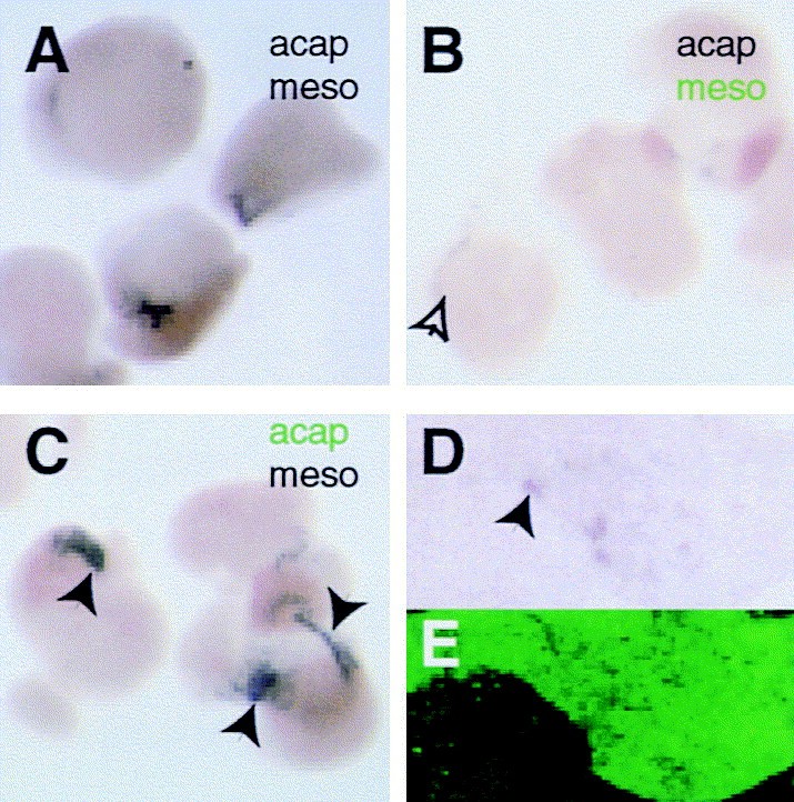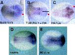 Fig. 7. Elevated retinoid signalling in the ectodermal component of neural-inducing conjugates results in the increased expression of the primary neuron marker, NST. (AâC) NST expression in conjugates of animal cap ectoderm and dorsolateral mesoderm, grown in 10â7 M RA and assayed at the late neurula stage for the expression of NST. The component injected with RAR/RXR mRNA is indicated in green print. Expression of NST is increased (black arrows) in area in conjugates that received RAR/RXR in the animal cap component (C) compared to controls (A). Conjugates with additional RAR/RXR transcripts in the mesoderm (B) showed less and reduced NST expression possibly because the retinoid signalling ventralizes the mesoderm (Ruiz i Altaba and Jessell, 1991) and makes it a poorer neural inducer. (D,E). A section through one of the conjugates shown in (C) seen under normal (D) and uv (E) light to correlate NST expression (blue patches indicated by arrows) in (D) with the animal cap ectodermal component of the conjugate (green fluorescence) in (E).