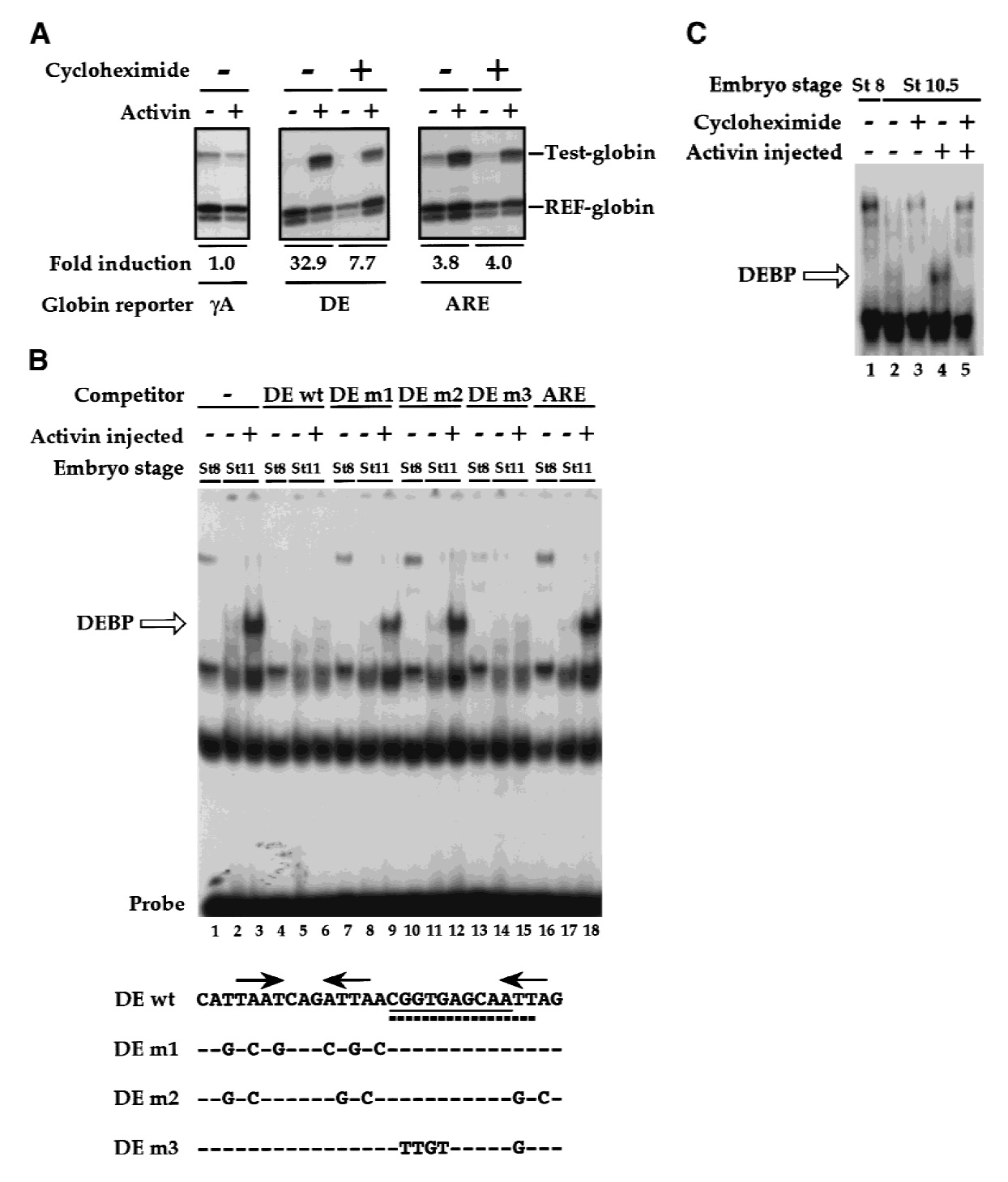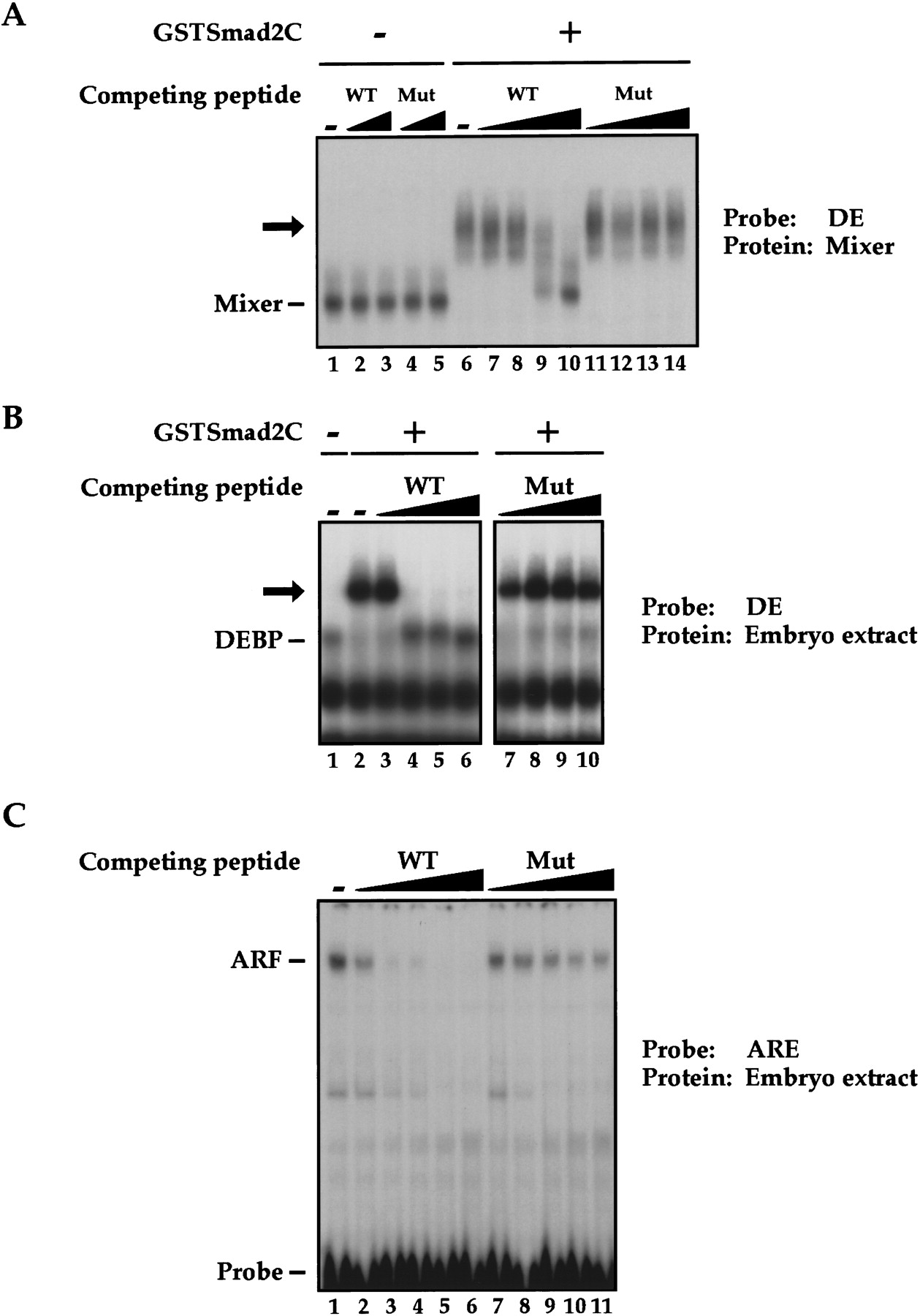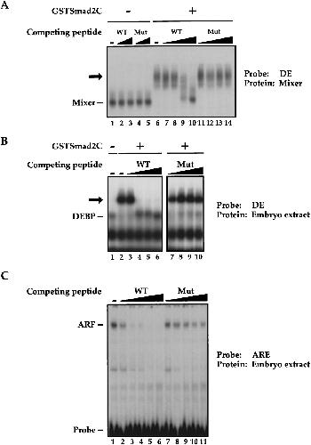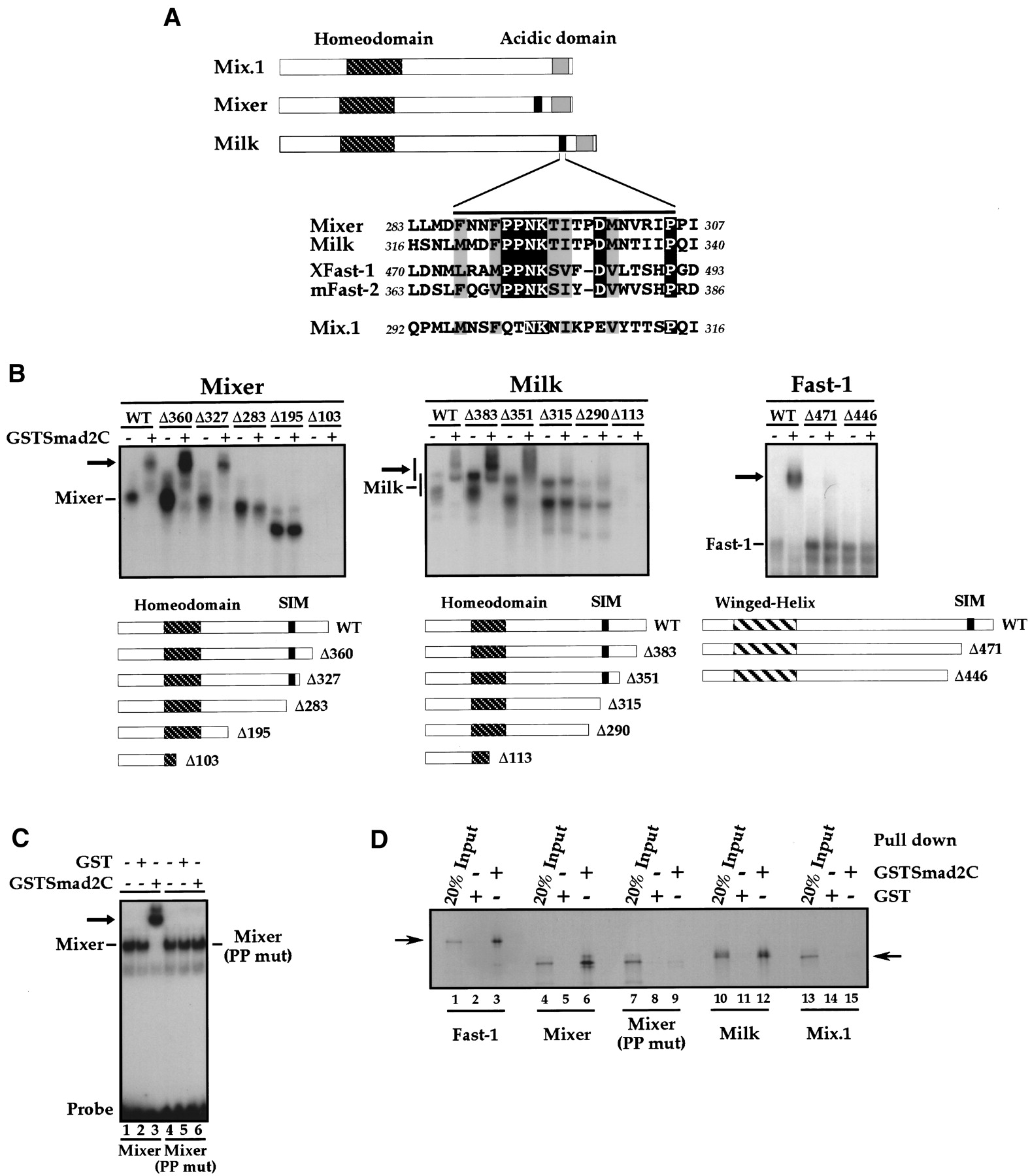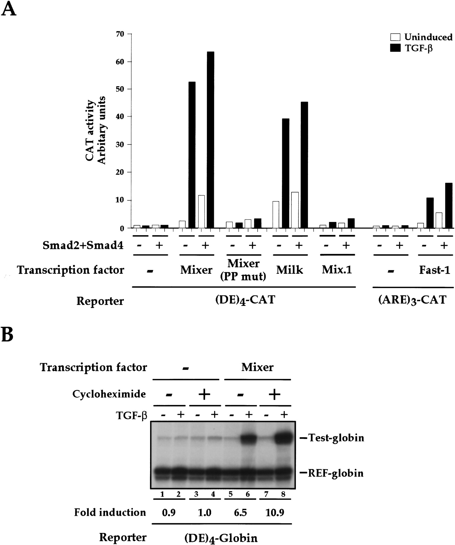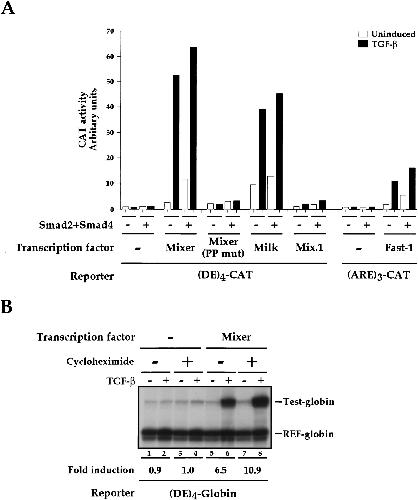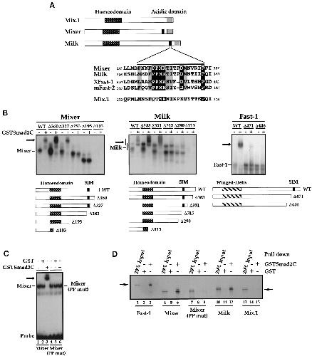 We have investigated the regulation of the activin-inducible distal element (DE) of the Xenopus goosecoid promoter. The results show that paired-like homeodomain transcription factors of the Mix family, Mixer and Milk, but not Mix.1, mediate activin/TGF-beta-induced transcription through the DE by interacting with the effector domain of Smad2, thereby recruiting active Smad2/Smad4 complexes to the Mixer/Milk-binding site. We identify a short motif in the carboxyl termini of Mixer and Milk, which is demonstrated to be both necessary and sufficient for interaction with the effector domain of Smad2 and is required for mediating activin/TGF-beta-induced transcription. This motif is not confined to these homeodomain proteins, but is also present in the Smad2-interacting winged-helix proteins Xenopus Fast-1, human Fast-1, and mouse Fast-2. We demonstrate directly that transcription factors of different DNA-binding specificity recruit activated Smads to distinct promoter elements via a common mechanism. These observations, together with the temporal and spatial expression patterns of Mixer and Milk, lead us to propose a model for mesoendoderm formation in Xenopus in which these homeodomain transcription factor/Smad complexes play a role in initiating and maintaining transcription of target genes in response to endogenous activin-like signals.