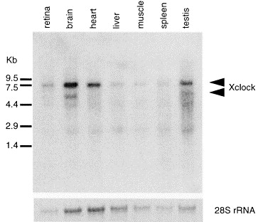 Fig. 4. Analysis of Clock mRNA expression in non-retinal tissues. RNA was isolated from the Xenopus tissues indicated. All dissections were done at approximately ZT 2. Northern blots were done with approximately 3 μg of total RNA per lane, using random primed probes prepared from the full length XClock cDNA. The arrow heads mark the two most-prominent XClock mRNAs. Prior to blotting, the gel was stained to visualize the rRNA bands as loading controls (the 28S rRNA band is shown).