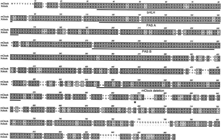 Fig. 1. Amino acid sequence comparison of the CLOCK proteins from Xenopus and mouse. The deduced amino acid sequence of the Xenopus CLOCK protein was aligned with the mouse sequence using the ClusalW algorithm. Identical amino acids are highlighted in dark gray and similar amino acids (conservative changes) are highlighted in light gray. Introduced gaps are shown as dashes (- - -). The regions corresponding to the bHLH, PAS A and PAS B domains are underlined and labeled. The positions of the known Clock mutations are also marked, including the location of the deletion found in the mouse Clock mutant (underlined and labeled) [23]and the position of the stop codon in the Drosophila Clock mutant jrk (asterisk at N608) [1].
