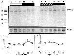Fig. 3. Temporal analysis of Clock mRNA expression in Xenopus retina. RNA was isolated from Xenopus retinas collected at 4-h intervals throughout the day from eyecups cultured in either 12L:12D light:dark cycles or in constant darkness. (A) Northern blot analysis of Clock mRNA levels. Each lane contains about 3 μg of total RNA. The times (ZT) of collection for each sample are shown above the blot. The bars above the blot indicate the lighting conditions at the time of harvest: black bars represent night (dark), white bars represent light during the day, and hatched bars represent dark during the day (subjective day). The blot shown is representative of three independent experiments. In each case, the filter was stripped and reprobed with a chicken β-actin probe [11]for normalization. The position of RNA size standards are indicated. (B) Quantitation of Clock mRNA levels at 4-h intervals in light:dark cycles (left) or in constant dark (right). The graphs show the mean relative Clock mRNA levels from three independent Northern blots, including the one shown in (A). Error bars indicate the S.E.M. and are too small to visualize for some of the points.