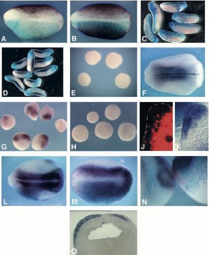 Fig. 1. XBF-1 induces neural tissue autonomously, at the expense of epidermis and in the absence of mesodermal signals. XBF-1 induces ectopic XSox3 even when cell division is blocked. Embryos were injected with a high dose of XBF-1 plus lacZ RNA or lacZ RNA alone (A or B respectively; light blue) and hybridised with a probe for epidermal keratin (dark magenta). Other embryos (C,D) were injected with XBF-1 plus lacZ RNA and were analysed at the tadpole stage for lacZ (C,D; light blue), N-tubulin (C) and muscle actin (D) expression (magenta). Note that ectopic N-tubulin expression is not accompanied by a corresponding expansion or ectopic expression of muscle actin. XBF-1 injected animal caps do not express collagen type II (E), which in the embryo is expressed in the somites and notochord (F). In contrast, XBF-1 injected (G), but not control uninjected (H), animal caps express XSox3. In this experiment, XBF-1 injected animal caps were combined with control RLDx labelled caps (E,G,H,J). Fluorescent (J) and bright-field (K) images of a sectioned animal cap demonstrate that XSox3 expression is localised in the XBF-1 injected part of the XBF-1/RLDx animal cap conjugate. Embryos (L,M) were injected with a high dose of XBF-1 and lacZ RNA and some of these were treated with HUA at the early gastrula stage (M). All embryos shown (L-N) are hybridised with XSox3. Embryos injected with lacZ and treated with HUA have normal XSox3 expression while both XBF-1 injected (L) and XBF-1 injected plus HUA (M) treated embryos show an expansion of the XSox3 expression domain. The expansion of the XSox-3 expressing domain in HUA- treated XBF-1 injected embryos can be clearly seen in section (O). HUA treated embryos (N, embryo on the right) have larger nuclei than sibling controls (N, embryo on the left) illustrating that cell division has been effectively blocked by the HUA treatment. |