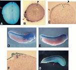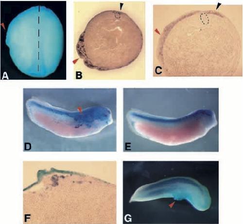 Fig. 2. XBF-1 induces tissue outgrowths in the ectoderm. In all panels, a red arrowhead indicates convoluted and/or thickened ectoderm on the side that has been injected with XBF-1 RNA (all panels except E and F) or DNA (F). Whole embryo (A) and transverse sections (B,C) of neurula embryos hybridised with N- tubulin (B) and XSox3 (C; C is also lightly stained for BrdU incorporation). Note the dramatic thickening of the ectopic neural tissue (red arrowhead) compared with the normal neural tissue on the control side (black arrowhead). The dotted line demarcates the dorsal midline (A) or the notochord (B,C), separating the injected (left) from the uninjected side. Tadpole stage embryos were hybridised with N-tubulin (D, the injected side; E, the control side; F, high magnification of a section through D) and muscle actin (G) (magenta staining in all). In G, note that there is no ectopic muscle actin expression in the lateral protrusion. In embryos shown in D-G, XBF-1 RNA or DNA was coinjected with lacZ RNA (light blue). |