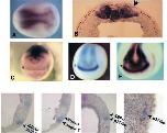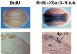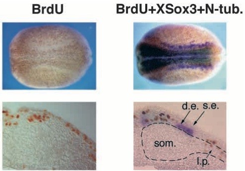 Fig. 3. XSox3 and N-tubulin expression marks proliferating and post- mitotic neural cells, respectively. Embryos were processed either for BrdU incorporation alone (left panels) or simultaneously for BrdU incorporation, XSox3 (light blue or green) and N-tubulin (magenta) expression (right panels), as described in Materials and Methods. Top panels show the whole mounted embryos and the bottom panels the respective transverse sections. XSox3 expression overlaps with BrdU incorporating cells while N-tubulin is expressed in cells that do not incorporate BrdU. Note that the deep layer of the epidermal ectoderm is also heavily dividing at this stage. A dotted line demarcates the underlying somitic and lateral plate mesoderm. d.e., deep layer of the ectoderm; l.p., lateral plate mesoderm; s.e., superficial layer of the ectoderm; som., somitic mesoderm. |