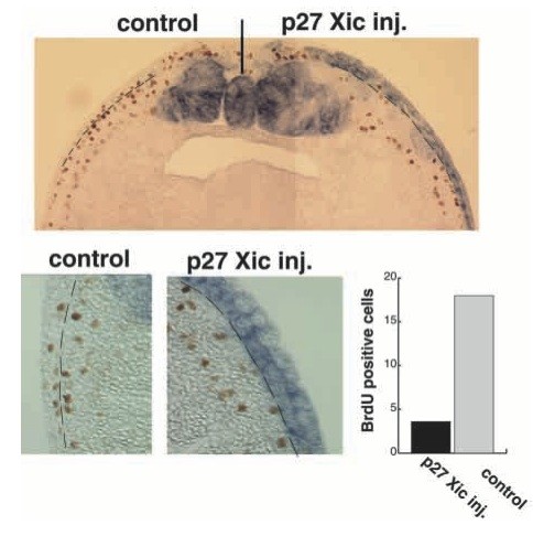 Fig. 6. p27XIC1 blocks cell division when misexpressed. p27XIC1 misexpression abolishes BrdU incorporation in the ectoderm. Embryos were injected with p27XIC1 RNA at the two-cell stage and processed for p27XIC1 expression by in situ hybridisation (blue/purple) and BrdU incorporation (brown nuclei) in transverse sections. In situ hybridisation with a p27XIC1 probe revealed both the expression of the endogenous gene and the distribution of the injected p27XIC1 RNA, both of which coincide with a complete absence of BrdU staining. The numbers of BrdU positive cells on the p27XIC1 injected side in comparison with the uninjected side are also represented as a column chart. The BrdU count is represented as BrdU positive cells per section, over the neural fold area and was averaged from 15 sections over three embryos in two independent experiments. Sections scored were from the anterior spinal cord level. Error bars were too small to illustrate. |