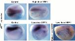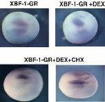 Fig. 9. p27XIC1 is a direct target of XBF-1. Dexamethasone-inducible XBF-1 RNA suppresses p27XIC1 in the presence (bottom panels) and absence (top right) of the protein synthesis inhibitor, cycloheximide. In the absence of both dexamethasone and cycloheximide, XBF-1- GR did not suppress p27XIC1 expression (top left panel). |