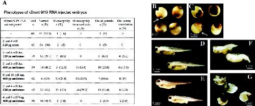 Figure 2. Phenotypes of sense and antisense xDnmt1RNA-injected embryos. (A) Table showing the phenotypes of stage 35 embryos after injection of synthetic xDnmt1 RNA. (B) Four control embryos (stage 12.53) undergoing normal gastrulation and almost closing the blastopore (indicated by arrow). (C) The injection of 520 pg of antisense xDnmt1 RNA into the animal pole at two-cell stage slows gastrulation and disturbs the convergent extension movements of ectomesoderm. Shown are four representative gastrulae at the equivalent of stage 12.53. Note the extended appearance of the embryos and the large blastopore (indicated by arrow). (D) Uninjected control embryos at stage 35. (E) Injection of 520 pg of sense xDnmt1 RNA into two- and four-cell blastulae or 400 pg of antisense RNA into the vegetal pole does not lead to any visible developmental abnormalities. (F) The injection of a low dose antisense RNA (400 pg) into the animal pole of two- and four- cell blastulae causes the embryos to develop microcephally as shown at the equivalent of stage 35. (G) The injection of a high concentration (52000 pg) of the antisense RNA leads to considerable shortening of the dorsal axis in addition to microcephally. |