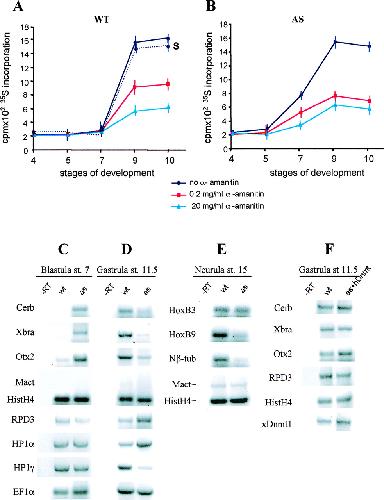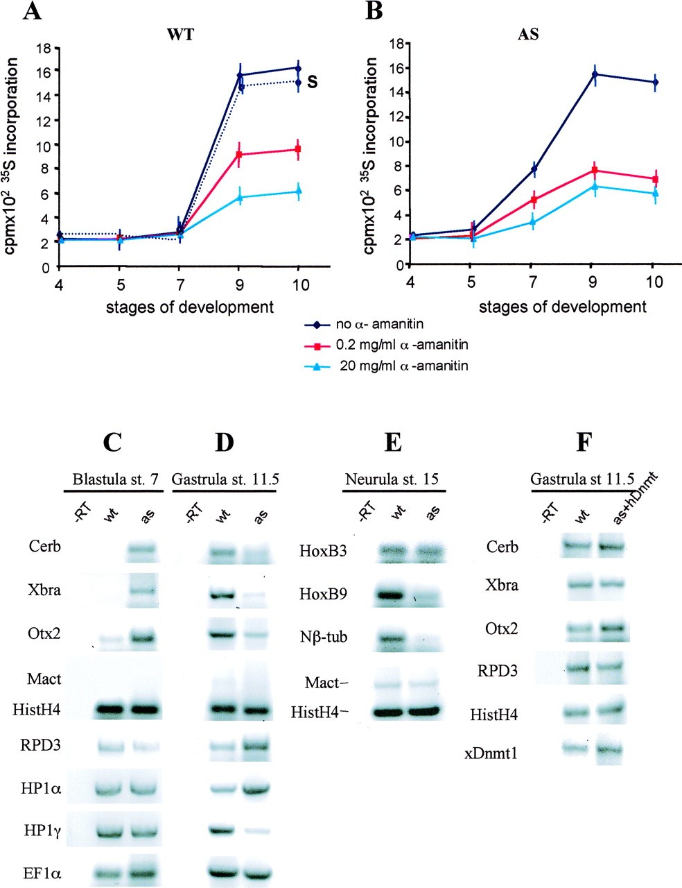 Figure 6. xDnmt1-depleted embryos initiate zygotic transcription before MBT. (A) The incorporation of microinjected (50 nCi) [α-35S]UTP was used to detect the activation of gene expression in wild-type (WT) and sensexDnmt1 RNA (S) injected embryos. Wild-type blastulae were grown also in the presense of α-amanitin for the indicated amounts. (B) Embryos injected with antisense RNA and 50 nCi [α-35S]UTP (AS) at two-cell stage were cultured in parallel to the wild-type siblings and collected at the same time points as in A indicated on the graph. (C) RNA derived from wild-type (wt) and antisense-injected (as) embryos at stage 7 was assayed by RT-PCR for the transcripts of the mesodermal marker genes (Cerb, Xbra, Otx2), chromatin-related proteins (RPD3, HP-1α and γ) and ubiquitously expressed EF1α (D) RT-PCR analysis of normal (wt) and xDnmt1-depleted (as) embryos at stage 11.5. Cerberus, Xbra, and Otx2 are down-regulated in the xDnmt1-depleted gastrulae. RPD3and HP1α are present at higher than normal levels. (E) RT-PCR analysis of normal (wt) andxDnmt1-depleted (as) embryos for the expression of the homeobox containing genes HoxB3 and HoxB9, neural β-tublin (Nβtub), muscle-specific actin(Mact), and histone H4 (Hist H4). (F) Antisense gastrulae rescued with 12 pg of mouse Dnmt1 protein (asâ+âhDnmt1) contains similar to wild-type (wt) levels ofCerberus, Xbra, xDnmt1, RPD3, and histone H4 transcripts. The expression of Otx2 always remained lower in the WT embryos. In C andF, âRT is a control PCR reactions of the antisense embryo RNA sample without reverse transcription. |