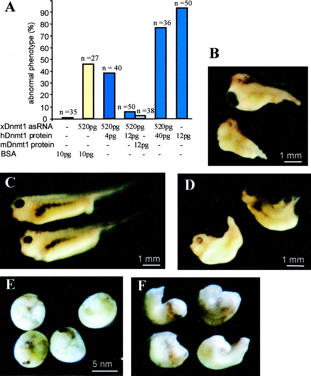Figure 4. Cross-species Dnmt1 proteins can substitute for the function of maternal xDnmt1 depleted by antisense RNA injection. (A) Microcephalic and axis-truncated phenotype of xDnmt1-depleted embryos can be rescued in a dose-dependent manner by coinjection of recombinant human (hDnmt1) or mouse (mDnmt1) Dnmt1 proteins with 520 pg of antisense xDnmt1 RNA. The percentage of resulting abnormal embryos scored at stage 35 was plotted for the experiments indicated underneath the bars. (n) Number of injected two-cell blastulae. Yellow indicates injection of antisense only; blue indicates injection of antisense plus recombinant hDnmt1p protein; light blue indicates injection of antisense plus recombinant mDnmt1p protein. (B) Both proteins (4 pg) cannot rescue the microcephalic phenotype. (C) Coinjection with 12 pg of human or mouse Dnmt1protein in the majority of cases can restore the normal appearance. (D) The rest of the embryos have normal or even enlarged heads, but still a very short axis. (E) hDnmt1 protein (40 pg) coinjected with the antisense RNA results in no-axis phenotype similar to that caused by injection of 12 pg of hDnmt1 protein alone into the animal pole at two-cell stage. (F) Vegetal pole cells are sensitive to the same amount (12 pg) of hDnmt1 protein injected alone. Vegetal injection into two-cell blastulae leads to multiple defects as shown at stage 35. |