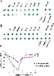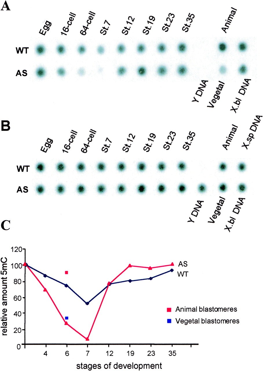 Figure 5. Changes in the levels of 5-methylcytosine (m5C) during development of wild-type andxDnmt1-depleted embryos. (A) m5C was detected in the DNA of wild-type (WT) and xDnmt1-depleted (AS) embryos at the indicated stages (from egg to stage 35 tadpole). The antibody does not recognize the nonmethylated S. cerevisaeDNA (Y DNA). Note that there are higher levels (approximately three fold) of m5C in the DNA that derives from the animal pole blastomeres (An) than in the DNA from the vegetal cells (Veg). (X.bl)Xenopus blood and (X. sp) Xenopus sperm DNA samples. (B) The blot shown in A was stripped from the antibody and rehybridized with a mixture of Xenopus andS. cerevisae DNA to illustrate the equal DNA loading. (C) The relative amount of m5C in DNA of normal (WT) and xDnmt1-depleted (AS) staged Xenopus embryos as detected by the antibody in A in approximate units value. The wild-type oocyte DNA sample was taken as a standard (100%). |