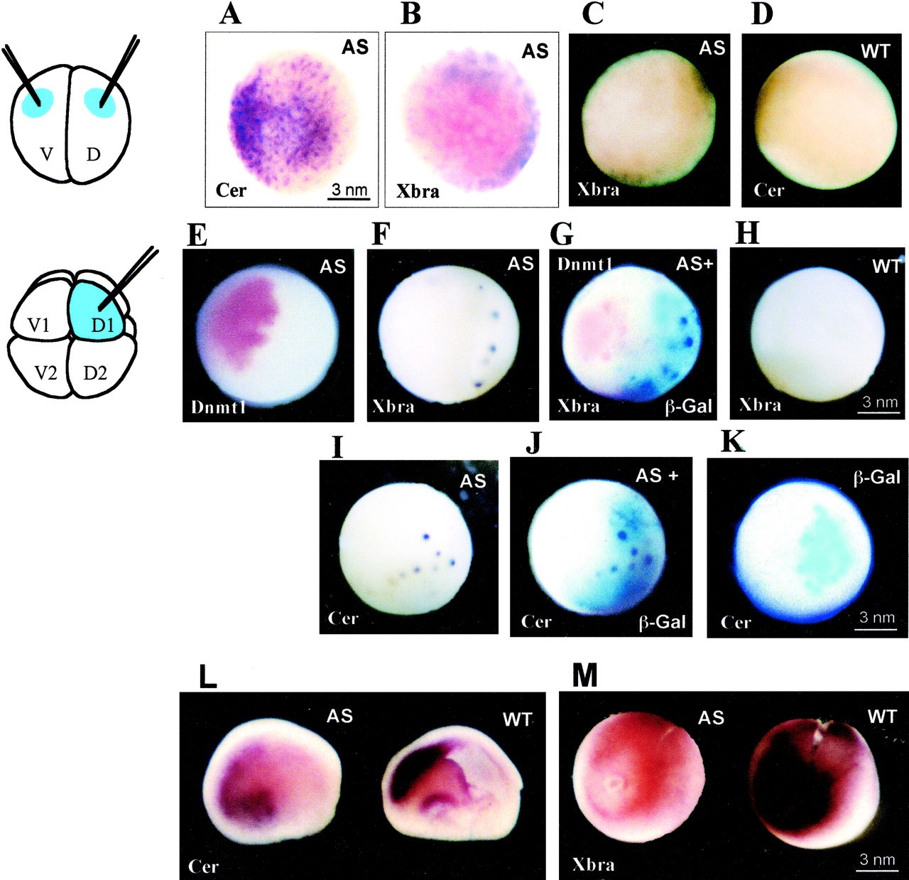 Figure 7. Localization of mesodermal markers in xDnmt1-depleted embryos before and after MBT. (A) Cerberus transcripts were detected by in situ hybridization in xDnmt1-depleted albino blastulae at stage 6.5. The albino embryos were injected symmetrically withxDnmt1 antisense RNA (as shown on the drawing).Cerberus transcripts localize predominantly to the most anterior animal blastomeres (purple staining). Animal view of the embryo. (B) Xbra transcripts (purple) in the antisense blastula of the same stage (6.5) appear around the midline zone (dorsal and ventral) and never overlap with the pattern ofCerberus expression. Animal pole view of the blastula. (C) Neither of the two transcripts are aberrantly expressed in the vegetal pole blastomeres of the antisense injected embryos (hybridization with Xbra is shown). (D) Wild-type blastula at stage 6.5 do not express Cerebrus or Xbra(control hybridization with Cerberus). (E) Ectopic injection of antisense RNA and β-gal sense RNA into a single dorsal animal blastomere (D1) of eight-cell blastulae (as indicated on the drawing) depletes xDnmt1 transcripts in a portion of animal pole cells. Only the staining for xDnmt1 is shown (red). (F) Few cells of the dorsal midline zone express ectopically high levels of Xbra (purple). (G) The ectopicXbra expression (dark blue) colocalizes with the staining for β-gal (blue) on the injected site of a stage 6.5 blastula. Note that Cerberus and Xbra expression localize to different populations of cells. The staining forxDnmt1 is in red. (H) Uninjected embryo at stage 6.5 does not express Xbra or Cerberus. (I) A few of the most anterior animal cells that coincide with the site ofxDnmt1 depletion express high levels of Cerebrus(purple) in a stage 6.5 blastula. (J) The staining forCerebrus transcripts colocalizes with that of the β-gal tracer. (K) The control embryo at the same stage (6.5) injected with β-gal RNA only do not show any staining forCerberus or Xbra (control hybridization with Cerebrus probe). (L) In xDnmt1-depleted embryo (AS) at stage 12 the staining for Cerberus transcripts is reduced compared to a wild-type (WT) gastrula (Cerebrus in dark brown to black). The remaining transcripts still localize to the most anterior regions of dorsal mesoderm. (M) Xbra (dark brown to black staining) is dramatically reduced in xDnmt1-depleted gastrula at stage 12.5 (AS) as compared with the wild-type (WT) embryo. |