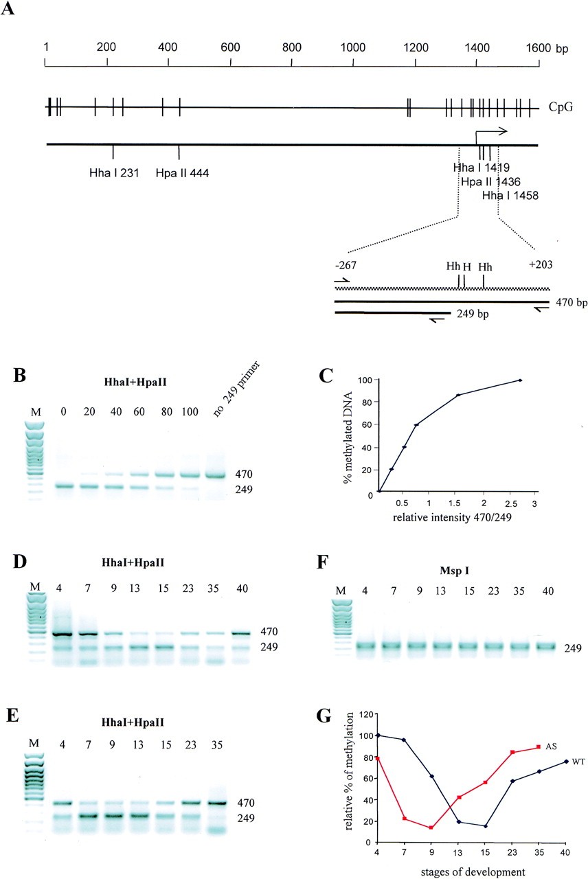 Figure 8. Sequences of Xbra promoter are hypomethylated earlier in xDnmt1-depleted embryos. (A) Schematic presentation of 1.6-kb region that covers the promoter and the first exon of Xbra gene. The CpG pairs in the sequence are shown by vertical lines. Underneath the CpG plot are indicated HpaII and HhaI sites. The position of transcriptional initiation is marked by an arrow. Sequences that were analyzed by methylation-sensitive PCR during development are shown on the expanded region below. A 470-bp PCR product covers the sequences between â267 and +203 where there are two HhaI (Hh) sites and one HpaII (H) site. The 470-bp band is produced only if the methylation-sensitive enzymes HpaII and HhaI do not cleave in these sites. When the restriction sites are cleaved it results in the appearance of 249-bp PCR product and is indicative of hypomethylation (see Materials and Methods). Digestion withMspI (which is not methylation sensitive) gives rise to the shorter product only. (B) To create a quantitative standard curve, a plasmid containing the Xbra promoter and part of the first Xbra exon (Latinkic et al. 1997) was methylated in vitro by SssI methylase and mixed with nonmethylated Xbraplasmid in the combinations shown. The mixtures were digested withHpaII and HhaI and used for PCR amplification resulting in fragments of 470 and 249, respectively. The percentage of methylation is indicated on top of each lane. M is a 100-bp DNA marker. (C) Standard curve generated from plotting the ratio of 470/249 fragments (X axis) against the percentage of DNA methylation (Y axis). (D) Genomic DNA samples from staged embryos indicated by numbers from 40 (stage) were digested withHhaI and HpaII and analyzed by methylation-sensitive PCR. (E) Genomic DNA samples of the xDnmt1-depleted embryos at equivalent stages to the wild type in B, indicated by numbers from 4 to 35, were digested with HhaI and HpaII, and subjected to PCR analysis as in B. (F) The same of set of DNA samples as in D was digested with MspI and analyzed as above. (G) Graphical plot of methylation changes in Xbra promoter during development of the normal (WT) and xDnmt1-depleted (AS) embryos. The ratio of 470-bp to 249-bp PCR products for each sample was quantitatively estimated and plotted against a standard curve to give the amount of methylated Xbra promoter as a % of the totalXbra promoter sequences present in the PCR reaction of genomic DNA at the indicated stages. |