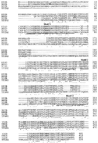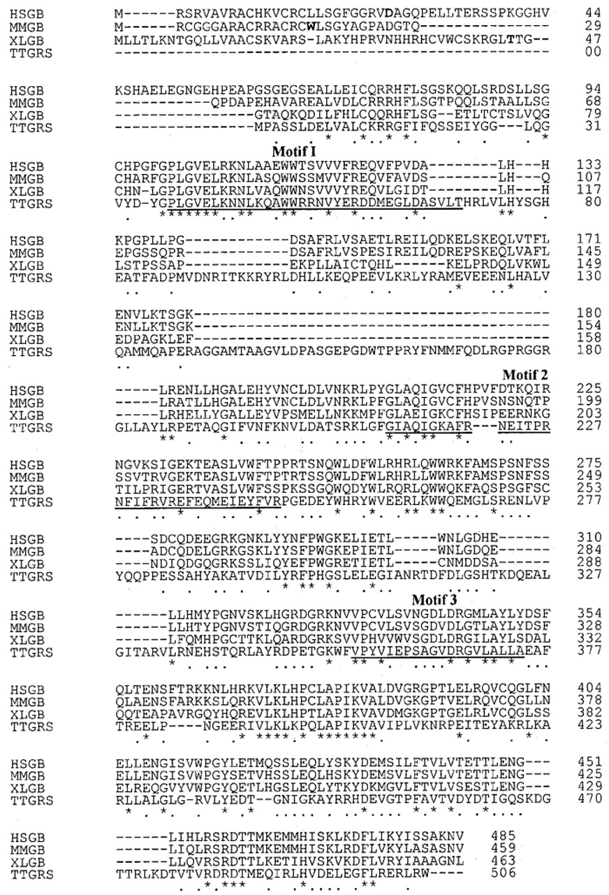 Figure 1. Alignment of vertebrate pol γB subunits with T.Thermophilus GRS. The program Clustal (PCGene) was used to align the sequences of human (HSGB; GenBank accession number AF177201) , mouse (MMGB; accession number AF177202) and Xenopus (XLGB; accession number AF124606) pol γB subunits with T.thermophilus GRS (TTGRS; accession number P56206) . Identical amino acids are indicated with asterisks; similar ones, with dots. The first amino acid of the mature Xenopus protein and the predicted ones for the human and mouse proteins are indicated in bold. The consensus motifs in class II aaRS sequences are underlined in the TTGRS sequence (31). The DNA sequence we determined for human pol γB includes a few changes with respect to the original sequence reported in GenBank U94703, as follows: silent T to C changes at positions 371 and 998; C to G at 448, resulting in a T122 to R change in the protein sequence; A to G at 488, resulting in S136 changed to G; G to A in 587, resulting in A169 changed to T; and a short frame shift caused by an insertion of an A in position 940 and a deletion of a C in position 961, resulting in a change of sequence TNFTTI to NKLYYN.