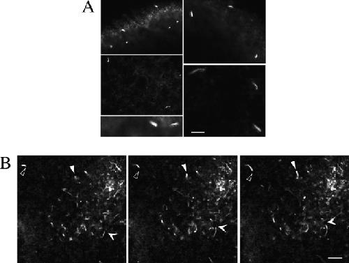 Figure 2. Comet tail formation in vivo induced by fertilization and PMA treatment. (A) Gallery of confocal images showing actin comet tails in eggs fixed 8 min after fertilization. F-actin was visualized by fluorescein-phalloidin staining. (B) In vivo time-lapse sequence (16-s intervals) showing rhodamine-actin comet tails (indicated by arrowheads) 20 min after treatment with 2 μM PMA. See Online Supplemental Material, Video 2 (http://www.jcb.org/cgi/content/full/148/3/519/DC1). Bars, 10 μm.