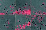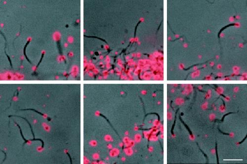 Figure 5. Accumulation of acridine orange, a marker for endosomes and lysosomes, in motile vesicles. Cell-free reactions (without rhodamine-actin) were monitored by phase contrast and fluorescence microscopy in the presence of 20 μg/ml acridine orange. A gallery of merged images (phase contrast and Texas red filter set) from three experiments is presented. 80% of the vesicles associated with comet tails strongly accumulated acridine orange (n = 417 comet tails). Bar, 10 μm.