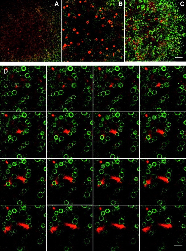 Figure 1. Actin comet tail formation in an activated Xenopus egg. (A) Vegetal pole of an egg, 2 min after activating the animal hemisphere by pricking with a glass micropipet. This region of the egg, viewed with a scanning laser confocal microscope, has not yet undergone activation-induced modifications. A diffuse distribution of rhodamine-actin and XPKCα-GFP is seen amidst the secretory cortical granules (1–3-μm-diam circular shadows) just beneath the plasma membrane. (B) Same region of the egg, 4 min after activation. The cortical secretory granules have undergone exocytosis and larger vesicles enriched in XPKCα-GFP (3–5-μm-diam) are now visible. As the egg reaches maximal contraction, large spherical accumulations of rhodamine-actin form amidst the field of vesicles. (C) A similar region of the egg after contraction (8 min after activation) showing numerous rhodamine-actin comet tails in a field of XPKCα-GFP vesicles of varying sizes. This is a tangential optical section, with the far right edge of the image showing microvillar tips on the egg surface and deeper regions of the egg cortex revealed on the left. (D) Time-lapse sequence (3.5-s intervals) showing the birth of rhodamine-actin comet tails. Actin assembly appears to be initiated by a PKC-enriched vesicle and ultimately effects a 10-μm displacement of that vesicle. See Online Supplemental Material, Video 1 (http://www.jcb. org/cgi/content/full/148/3/519/ DC1). Bars: (A–C) 10 μm; (D) 5 μm.