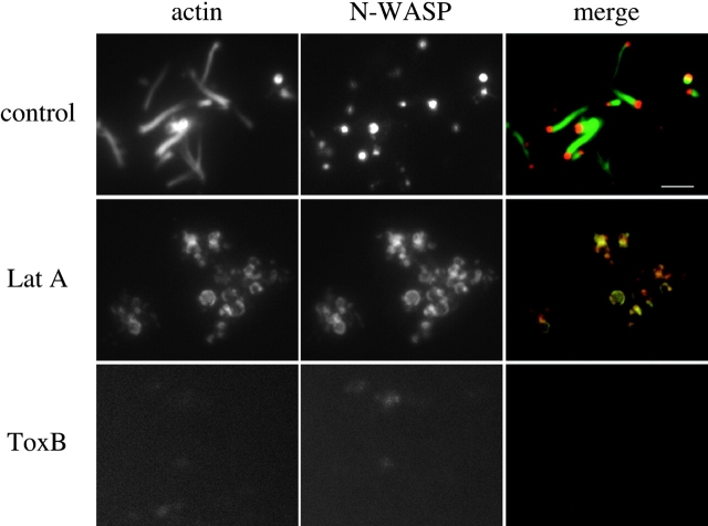 Figure 4. PMA stimulates the recruitment of N-WASP to vesicles associated with actin comet tails. Cell-free vesicle motility assays containing Xenopus cytosol, membranes, and 1 μM PMA were fixed in perfusion chambers and immunolabeled with affinity-purified anti–N-WASP antibodies followed by Texas red secondary antibodies and FITC-phalloidin. N-WASP and F-actin recruitment occurred in the presence of 75 μM latrunculin A, but comet tails were not observed. ToxB treatment prevented both N-WASP and F-actin recruitment, although nonspecific labeling of fixed membranes could be observed with long exposure times. Bar, 5 μm.