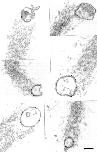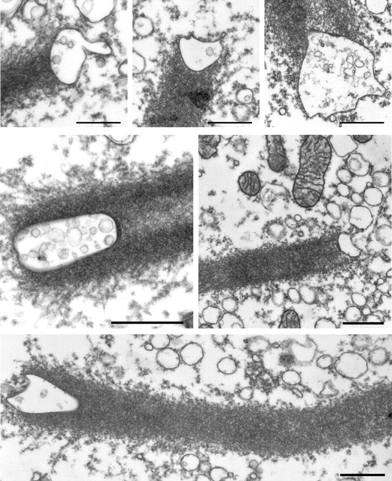 Figure 9. Gallery of electron micrographs depicting N-WASP immunogold-labeled HeLa vesicles associated with actin comet tails. Cell-free motility reactions containing unlabeled HeLa membranes were fixed in perfusion chambers, immunolabeled with affinity-purified N-WASP antibodies followed by 15 nm protein A–gold, and processed for electron microscopy. Gold particles are occasionally visible in the comet tails, but the vast majority are associated with the membrane. Note the similarity in vesicle morphology to the Xenopus egg vesicles shown in Fig. 6. Bar, 200 nm.