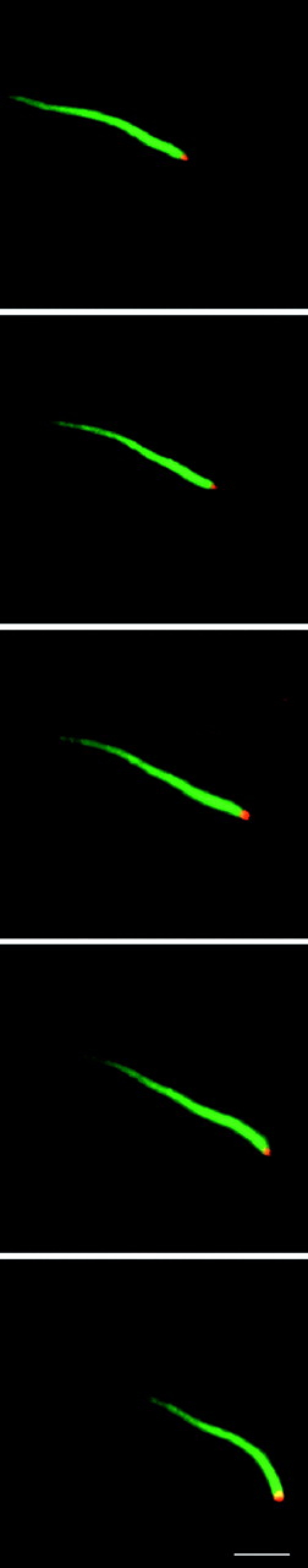 Figure 7. Actin-dependent propulsion of exogenous endosomes in Xenopus egg cytosol. HeLa cells were treated with Texas red transferrin (40 μg/ml) for 20 min at 37°C, and a postnuclear supernatant (PNS) was prepared. The PNS was diluted 60-fold with Xenopus egg cytosol containing 0.5 μM Alexa(488)-actin and 1 μM PMA. Alexa(488) and Texas red epifluorescence images were acquired every 10 s. Approximately half of the vesicles associated with actin comet tails contained internalized Texas red transferrin. Bar, 5 μm.