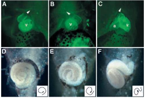 atrium, v, ventricle. (D) Normal coiling of the gut in a uninjected