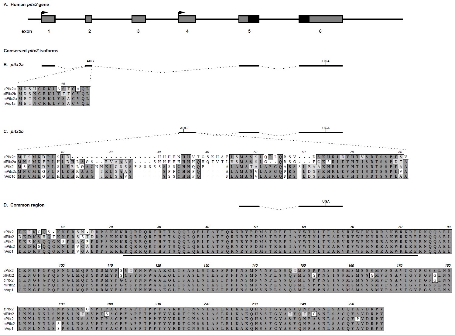 nomenclature of the Xenopus isoforms does not conform with the nomenclature of other species. (C) The zebrafish Pitx2c unique region