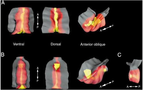 at sites A, B, and C, respectively. Labeling of overlying ectoderm and underlying endoderm occasionally occurs and can serve as a reference point