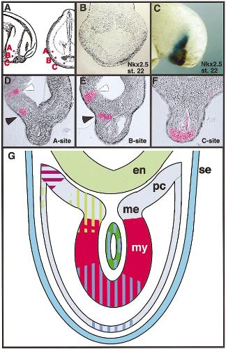 border of the stage 22 Nkx2.5 domain, site B corresponded to the lateral region, and site C was near the ventral midline. (D, E, and F) The positions
