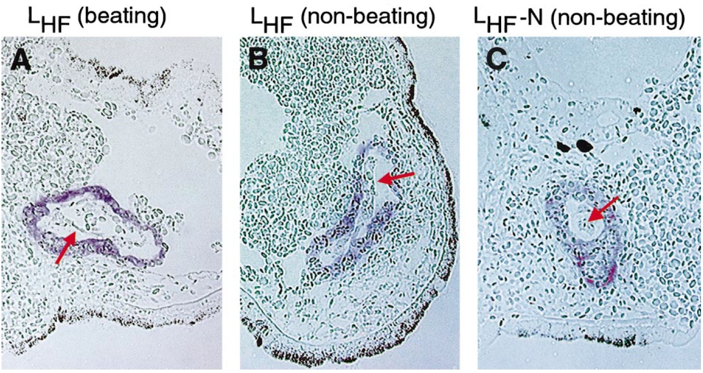 by in situ hybridization. Beating LHF (A) as well as nonbeating LHF (B) and LHF-N (C) explants formed a myocardial tube lined with unstained,