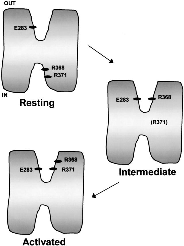 Using a strategy related to intragenic suppression, we previously obtained evidence for structural interactions in the voltage sensor of Shaker K(+) channels between residues E283 in S2 and R368 and R371 in S4 (Tiwari-Woodruff, S.K., C.T. Schulteis, A.F. Mock, and D. M. Papazian. 1997. Biophys. J. 72:1489-1500). Because R368 and R371 are involved in the conformational changes that accompany voltage-dependent activation, we tested the hypothesis that these S4 residues interact with E283 in S2 in a subset of the conformational states that make up the activation pathway in Shaker channels. First, the location of residue 283 at hyperpolarized and depolarized potentials was inferred by substituting a cysteine at that position and determining its reactivity with hydrophilic, sulfhydryl-specific probes. The results indicate that position 283 reacts with extracellularly applied sulfhydryl reagents with similar rates at both hyperpolarized and depolarized potentials. We conclude that E283 is located near the extracellular surface of the protein in both resting and activated conformations. Second, we studied the functional phenotypes of double charge reversal mutations between positions 283 and 368 and between 283 and 371 to gain insight into the conformations in which these positions approach each other most closely. We found that combining charge reversal mutations at positions 283 and 371 stabilized an activated conformation of the channel, and dramatically slowed transitions into and out of this state. In contrast, charge reversal mutations at positions 283 and 368 stabilized a closed conformation, which by virtue of the inferred position of 368 corresponds to a partially activated (intermediate) closed conformation. From these results, we propose a preliminary model for the rearrangement of structural interactions of the voltage sensor during activation of Shaker K(+) channels.