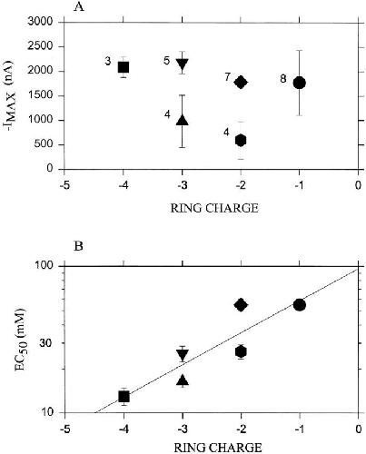 Figure 2. Responses of complexes of subunits mutated in the Glu ring. Oocytes were injected with all four types of subunits. In all cases, α contained the mutation T244C; this is designated α− if E241 is not also mutated, and α0 if in addition E241 is mutated to Q (i.e., the superscript indicates the charge of the residue in the position of the Glu ring). Wild-type β is designated β−; β with the mutation E252 to Q is designated β0; and β with the mutation E252 to K is designated β+. Wild-type γ is designated γ0. Wild-type δ is designated δ−, and δ with the mutation E255 to Q is designated δ0. The complexes tested were: α−2β−γ0δ− (i.e., a pseudo wild type with only αT244 mutated to C; ring charge, −4; square); α−2β0γ0δ− (ring charge, -3; up triangle); α−2β−γ0δ0 (ring charge, −3; down triangle); α02β−γ0δ− (ring charge, −2; diamond); α−2β+γ0δ− (ring charge, −2; hexagon); and α02β0γ0δ− (ring charge, −1; a circle). (A) The average maximum current (−IMAX) obtained from the fit of the Hill equation to the responses at various concentrations of ACh. (B) The average EC50 obtained from the fit of the Hill equation. The least-squares linear fit to the log(EC50) is shown. In each case, the abscissa is the sum of the charges in the ring. The numbers of independent experiments are indicated next to the symbols. The bars represent the standard errors of the means. |