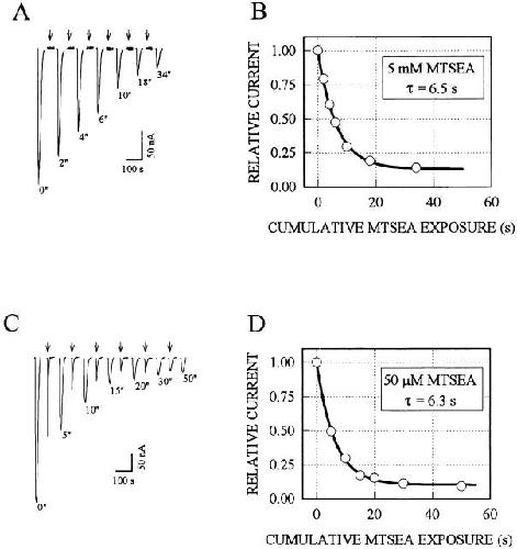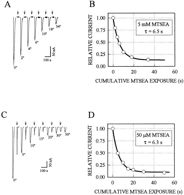 Figure 3. Kinetics of the reaction of MTSEA with the Cys at α244 exemplified with α02β0γ0δ−. MTSEA was applied to oocytes expressing α02β0γ0δ− in both the closed (A and B) and open (C and D) states at a holding potential of −50 mV. The sequence of applications to the oocytes was: 200 μM ACh for 10 s; bath solution for 3 min; 5 mM MTSEA for 2–16 s (beginning at arrows) for the closed state (A) or 50 μM MTSEA together with 200 μM ACh for 5–20 s (arrows) for the open state (C); bath solution for 3 min. This sequence was repeated several times, resulting in cumulative applications of MTSEA for the times shown under the peaks of the test responses to ACh. There was no decline in current during the 10-s applications of ACh; the return of the current to baseline began with the wash out of ACh. The peak current was normalized and plotted against the cumulative MTSEA exposure time in the absence (B) and presence (D) of ACh. Solid lines indicate least squares single exponential fits to the data, which yield the pseudo first- and second-order rate constants for the reactions (see materials and methods). |