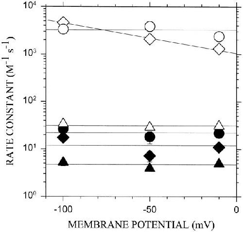 Figure 4. Second-order rate constants for the reactions of thiosulfonate reagents with α02β0γ0δ− as a function of the transmembrane potential. The rate constants were determined as in Fig. 2 for MTSEH (triangle), MTSEA (circle), and AEAETS (diamond) in the absence (filled symbols) and presence (unfilled symbols) of ACh, at various holding potentials. In each case, the mean ± SEM is plotted for recordings from three to four cells. |