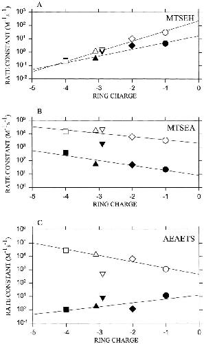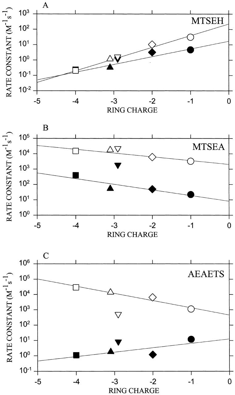 Figure 5. The second-order rate constants for the reaction of thiosulfonate reagents with receptors bearing different ring charges. The rate constants for the reactions at zero transmembrane potential are plotted for MTSEH (A), MTSEA (B), and AEAETS (C) applied both in the absence (filled symbols) and presence (unfilled symbols) of ACh. The correspondence between symbols and subunit combinations is the same as in Fig. 2. The lines are the linear least-squares fits. |