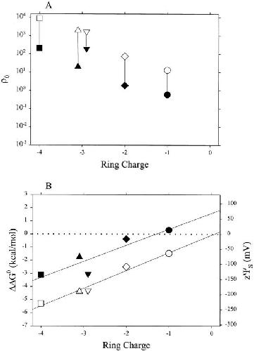 Figure 6. ρ0 and ΔΔG 0 for MTSEA and MTSEH as a function of ring charge. (A) The ratio of the rate constants for the reactions with the receptor was divided by the ratio of the rate constants for the reactions of MTSEA and of MTSEH with 2-mercaptoethanol in solution, thereby normalizing for the difference in the intrinsic reactivities of the two reagents (Pascual and Karlin 1998). This ratio of ratios, ρ0, is plotted versus the ring charge. Rate constants for the reactions of the mutant receptors in the presence (unfilled symbols) and absence (filled symbols) of ACh, at zero transmembrane potential, are from the data in Fig. 5. The symbols correspond to the same combinations of subunits as in Fig. 2. (B) ΔΔG 0 was calculated as −RTln(ρ0) and zψS was calculated as ΔΔG 0/F. |