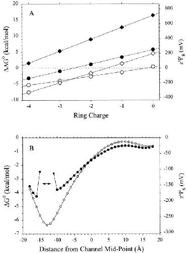 Figure 9. Electrostatic free energies of transfer into the model channel. (A). The differences (ΔΔG 0) in the ΔG 0 of MTSEA and MTSEH (circles) and of AEAETS and MTSEH (diamonds) are shown for both the open (unfilled symbols) and closed (filled symbols) states. In the open state, MTSEA was oriented as in Fig. 8, with the ammonium N at x = −14 Å, r = 0 Å. The ammonium of AEAETS closest to the -S− was placed at r = 0 Å and x = −14 Å, and the second ammonium closest to the -SO2− was at r = 0 Å and x = −4.4 Å. The hydroxyl hydrogen of MTSEH was placed in the same location as the ammonium of MTSEA, and the orientation of the molecule was similar. In the closed state, the head groups of the reagents were moved to x = −10 Å, while the orientations were unchanged. (B). ΔG 0 for the transfer of a Na+ from the extracellular solution to the channel was calculated at 1-Å intervals, from x = −18 to 18 Å. (The channel extends from −15 to 15 Å.) In the closed state, the Na+ was excluded from the gate, which extends from x = −14 to −12 Å (double-headed arrow). |