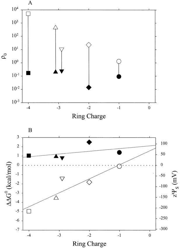 Figure 7. ρ0 (A) and ΔΔG 0 and zψS (B) for AEAETS and MTSEH. The details are as in Fig. 6. |