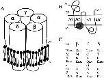 Figure 1. Schematic representation of the muscle-type ACh receptor. (A) The receptor complex in the membrane. (B) The common membrane topology of its subunits. (C) The aligned sequences of four mouse-muscle receptor subunits at the cytoplasmic ends of their M2 membrane-spanning segments and the M1–M2 loops. The sequences in C are from the region of the subunits covered with the shaded circle in B. The residues that were mutated in the work described here are in bold type. The numbering is that of the mature sequences. |