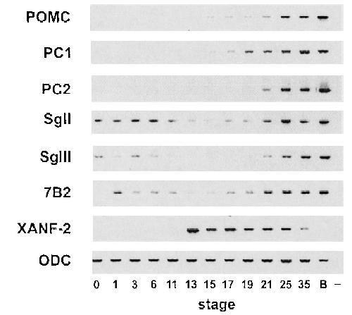 Differential onset of expression of mRNAs encoding proopiomelanocortin, prohormone convertases 1 and 2, and granin family members during Xenopus laevis development.