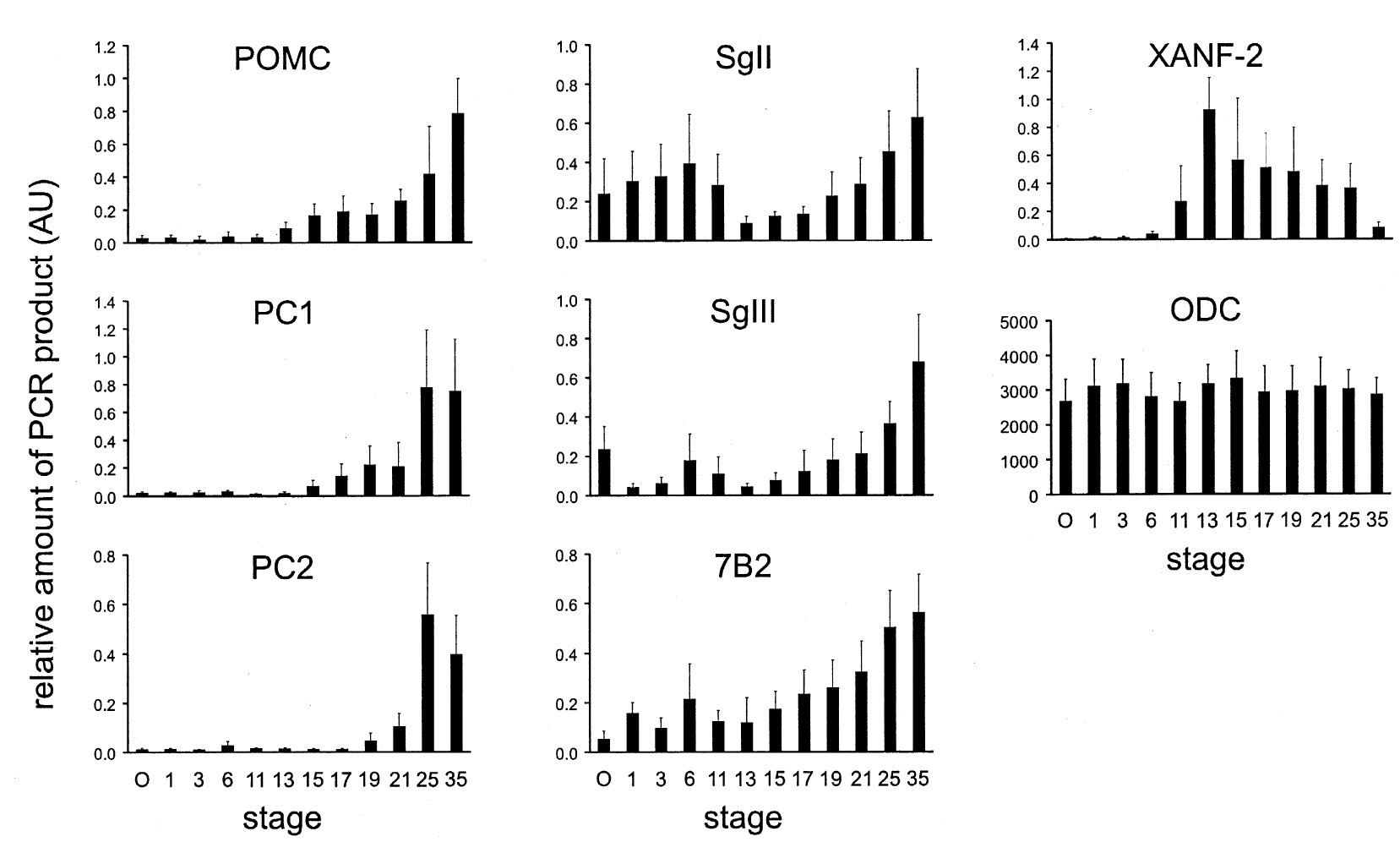 The production of peptide hormones through proteolytic cleavage of prohormones, e.g., proopiomelanocortin (POMC), involves a number of regulated secretory proteins, such as prohormone convertase PC1, PC2 and granin family members, that are co-expressed with the prohormone. Although the expression of these proteins has been well-studied in adult animals, data on their expression during development are limited. We used whole-mount in situ hybridization to visualize POMC mRNA expression in the intermediate and anterior pituitary of Xenopus tadpoles. A more sensitive analysis, namely semi-quantitative reverse-transcription polymerase chain reaction (RT-PCR) on total RNA isolated from Xenopus developmental stages, revealed that the expression of POMC, PC1 and PC2 mRNA commenced at stages 13 (neural plate stage), 15 (neural fold stage) and 19 (neural tube stage), respectively, with a gradual increase in their expression levels during further development. Surprisingly, and in contrast to what holds for POMC and the convertases, mRNAs for secretogranin II and III (SgII, SgIII) and 7B2 were not only expressed during neural development, but could already be detected in unfertilized mature oocytes, the first cleavage stages and in blastula-stage embryos. These granins are thus maternally present in Xenopus embryos suggesting that they may have a role during oogenesis and/or early embryonic development.